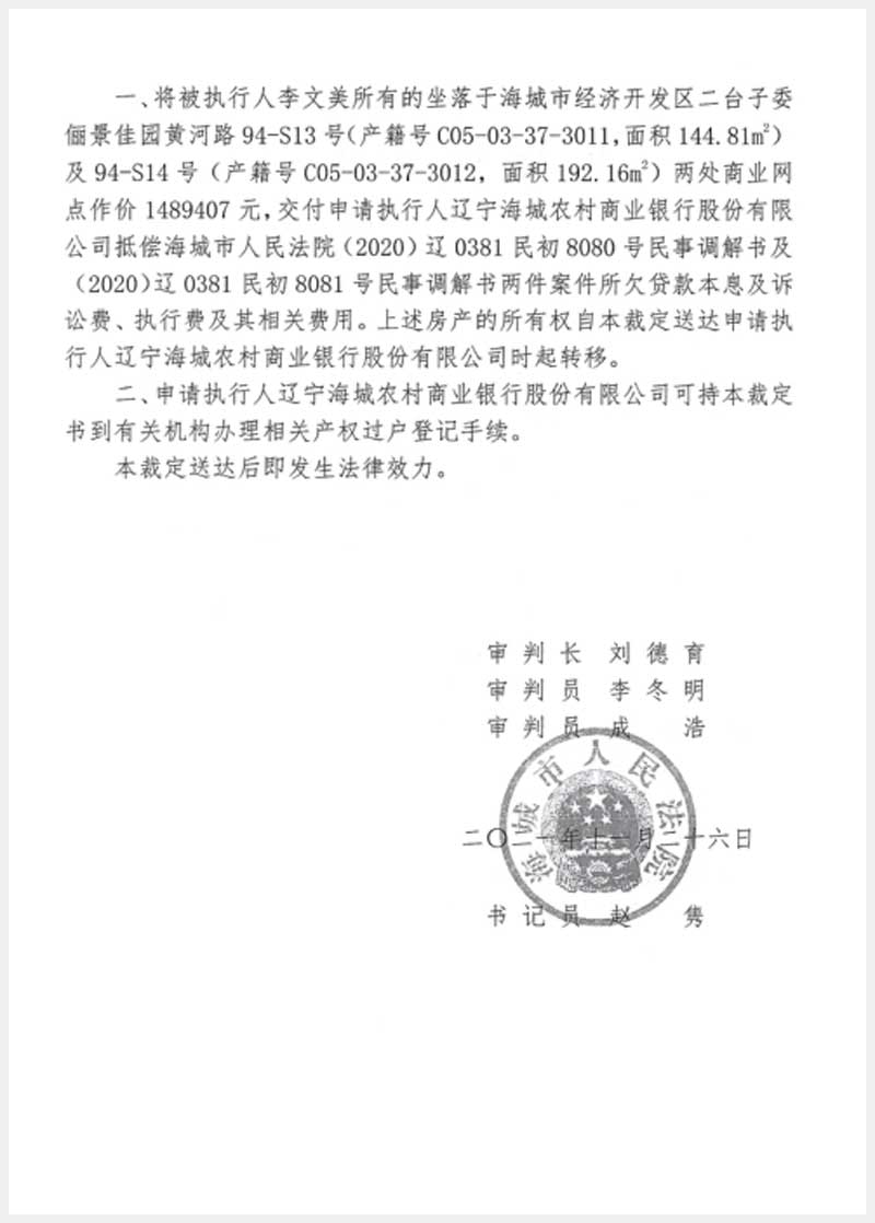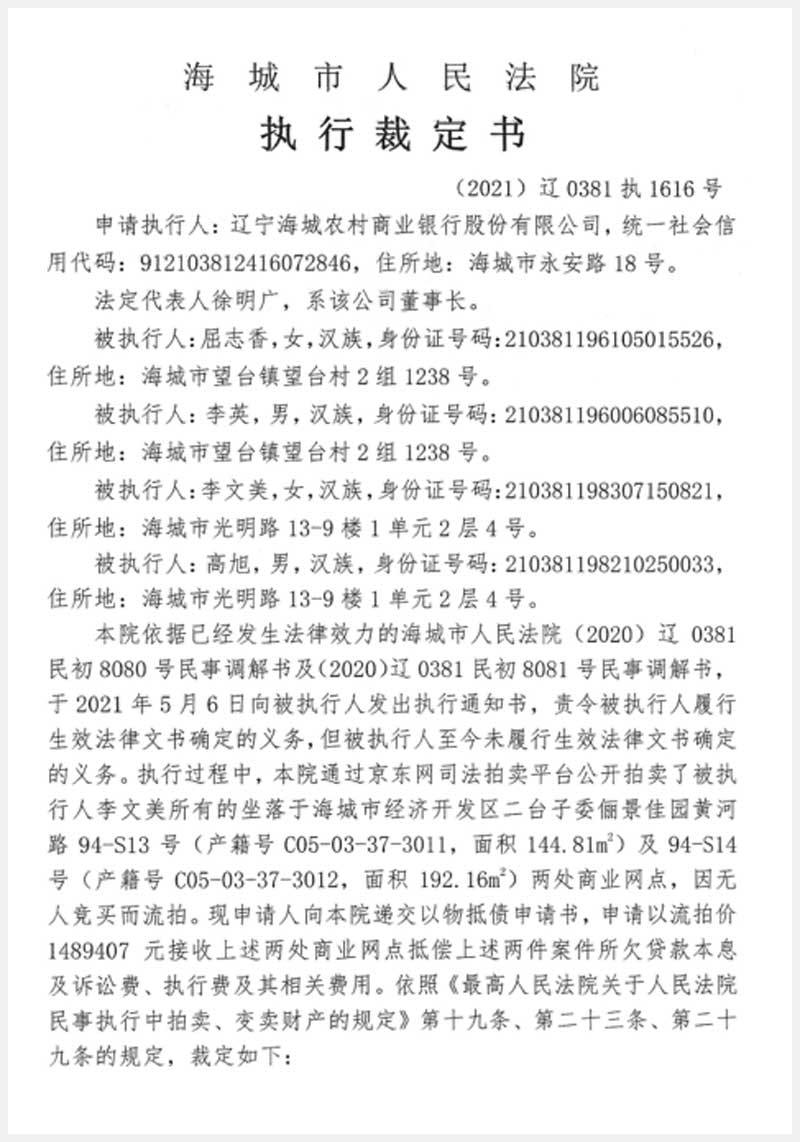 地址:海城經(jīng)濟(jì)技術(shù)開發(fā)區(qū)二臺(tái)子委儷景佳園 標(biāo)的號(hào):187