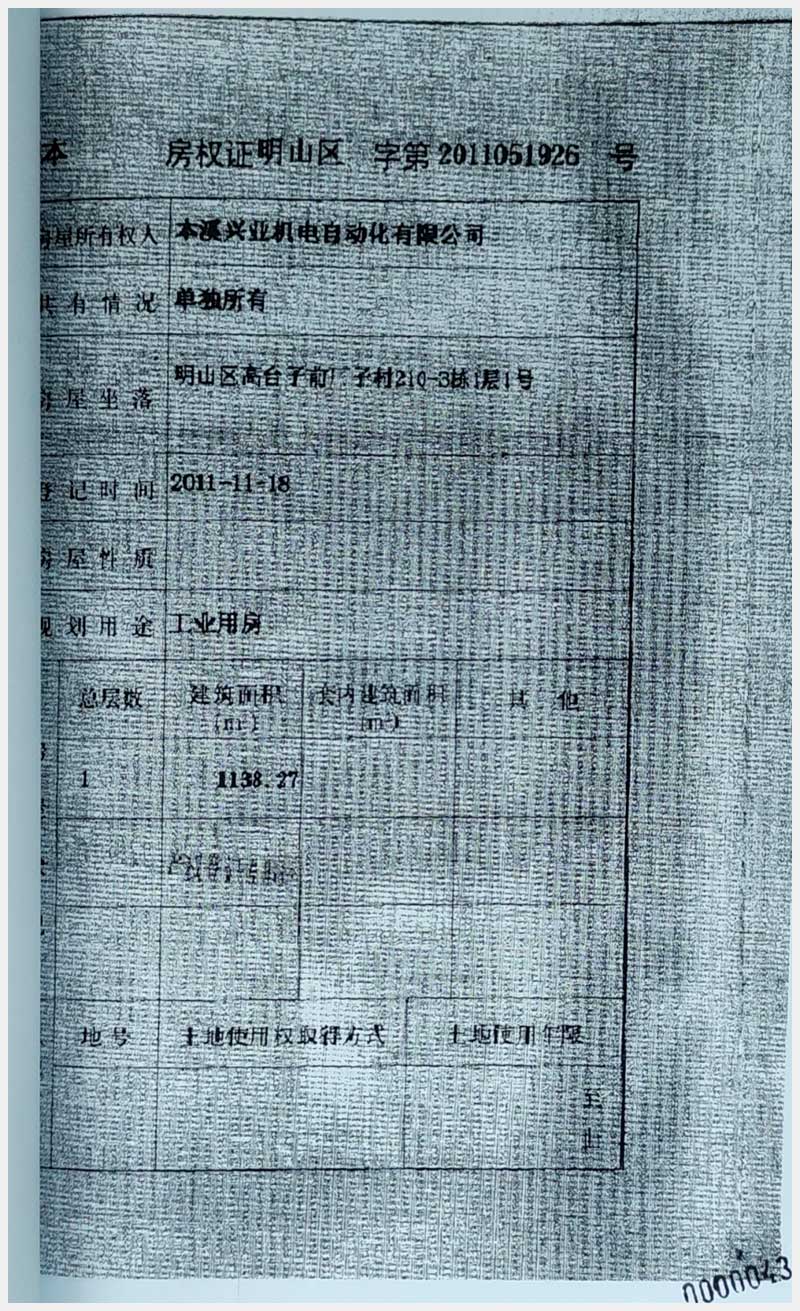 名稱:本溪市明山區(qū)高臺(tái)子前場路28-4棟1層房產(chǎn)及土地使用權(quán) 面積:房產(chǎn):4810.33㎡;土地:12300㎡ 瀏覽次數(shù):1042